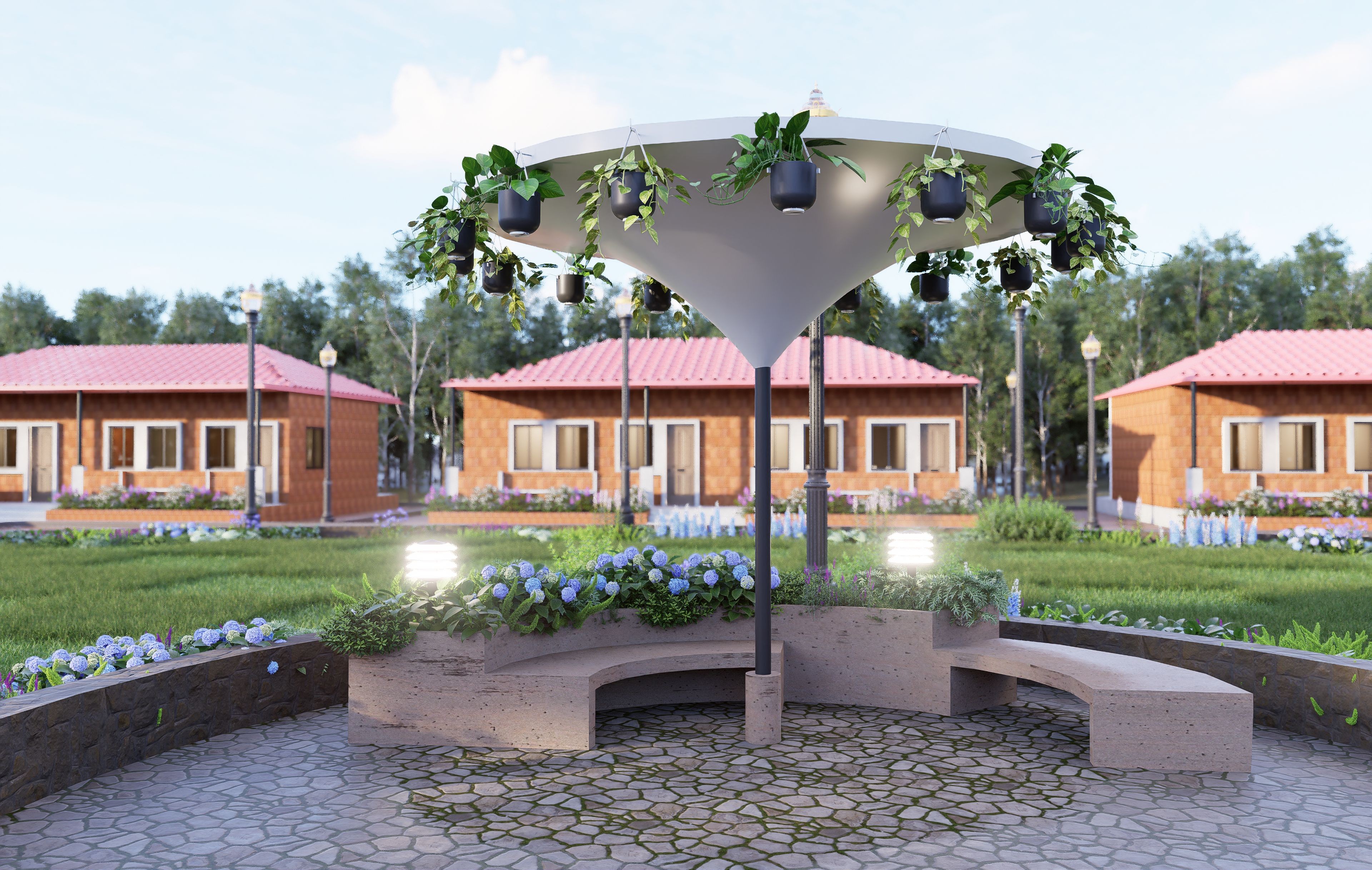 Integrated Layouts: Clear visualization of walkways, seating areas, and rest spots within the garden, confirming optimal flow and accessibility.