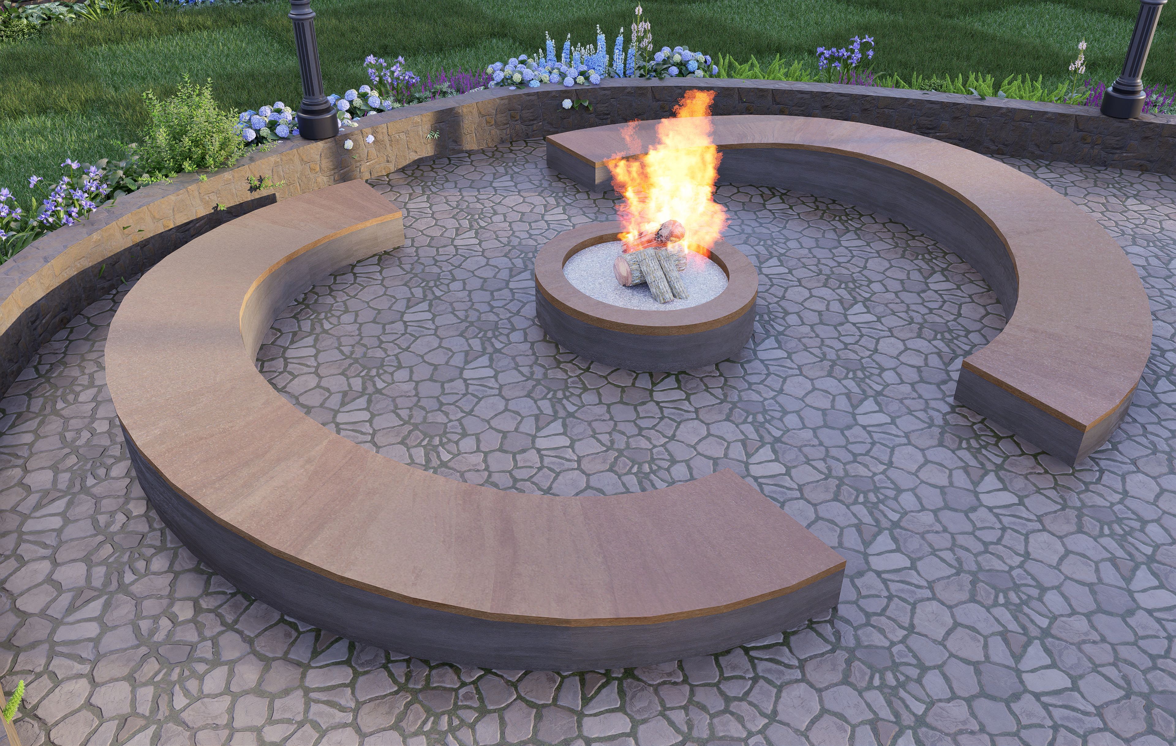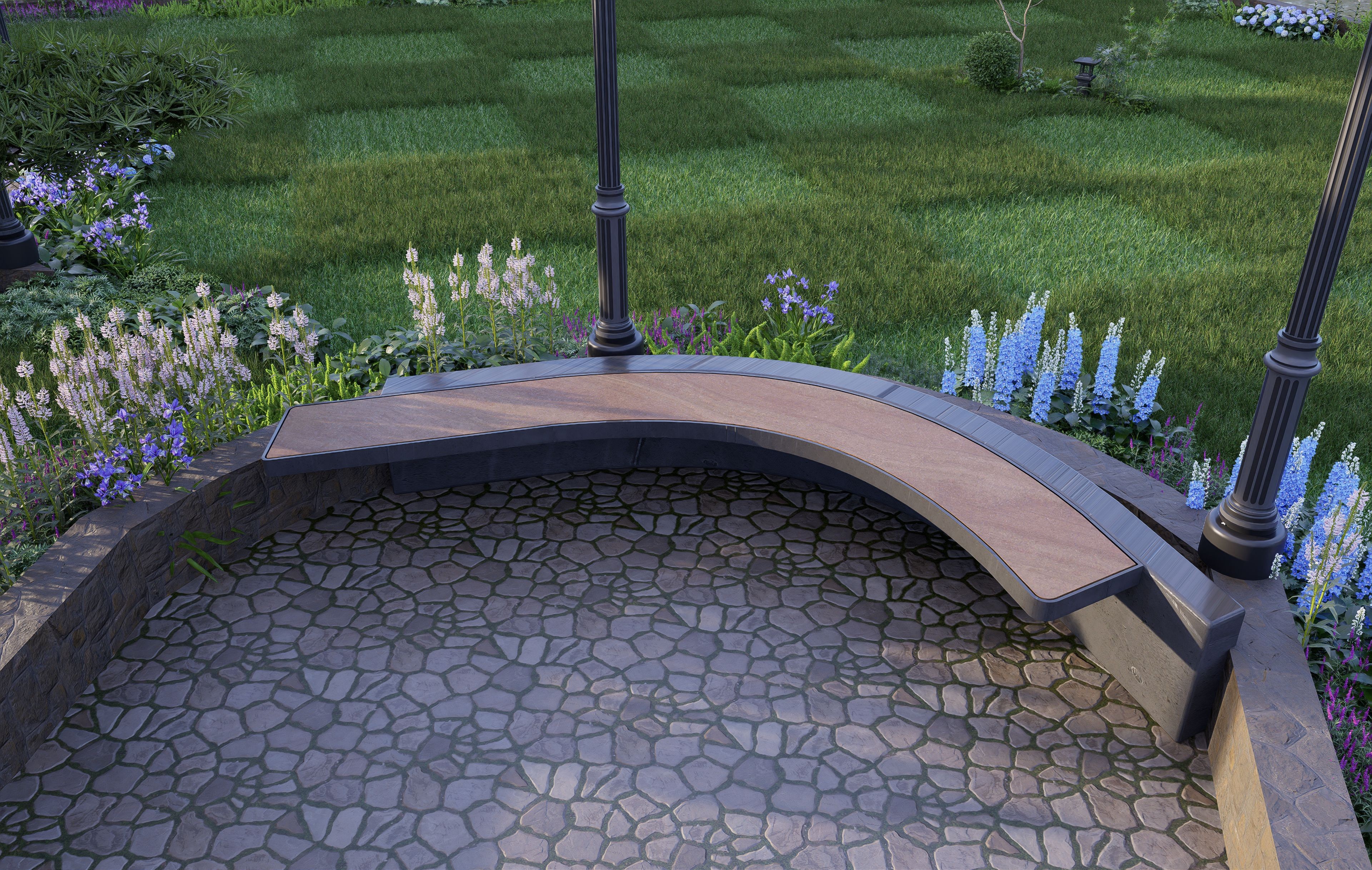 Hardscape Integration: Detailed views of how paving, natural stone, and wood elements for benches or pergolas are incorporated, ensuring they align with the design style.